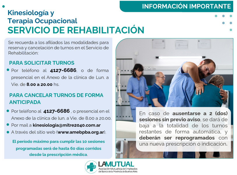 Te recordamos las modalidades de reserva y cancelación de turnos en el Servicio. de Rehabilitación de la Clínica AMEBPBA. Tené en cuenta que, ante la ausencia a 2 sesiones -sin previo aviso- se dará de baja a la totalidad de los turnos restantes de forma automática, y deberán ser reprogramados. Leé todo aquí.