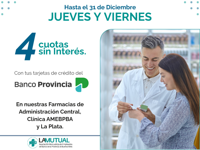 Pensando en vos, renovamos la promo. Todos los jueves y viernes, hasta el 31/12,4 CUOTAS SIN INTERÉS con tarjetas de crédito y débito del Banco Provincia, en Farmacias de Administración Central, Clínica AMEBPBA y La Plata. Una oportunidad pensada para cuidar tu salud y tu bolsillo.