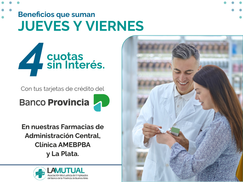¡Seguimos cuidándote con beneficios que suman! Todos los jueves y viernes, hasta el 31/12, 4 CUOTAS SIN INTERÉS con tarjetas de crédito y débito del Banco Provincia, en Farmacias de Administración Central, Clínica AMEBPBA y La Plata. Porque tu salud y tu economía merecen lo mejor ¡Agendala, compartila y aprovechala!