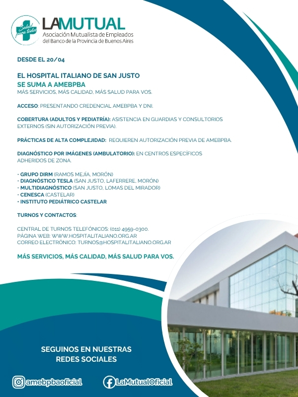 Desde el 20/04, el Hospital Italiano de San Justo se suma a AMEBPBA. Acceso con tu credencial y DNI. Guardias y consultorios externos: sin autorización previa. Alta complejidad: con autorización previa de LA MUTUAL. Más servicios, más calidad, más salud para vos. Leé más acá.