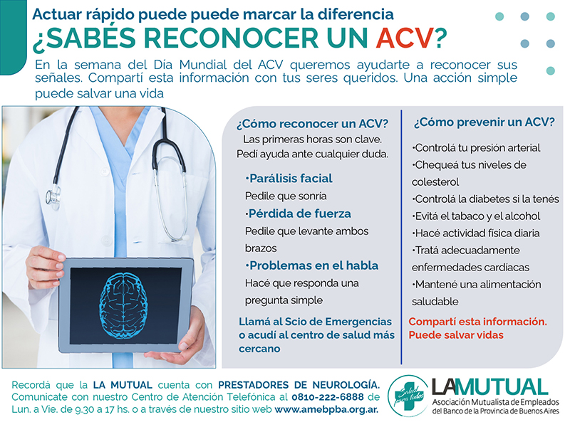 En la semana del Día del ACV queremos ayudarte a reconocer sus señales, ya que es esencial para brindar inmediatamente el tratamiento adecuado. Las primeras horas son cruciales, y es indispensable actuar a tiempo. Compartí esta información con tus seres queridos.