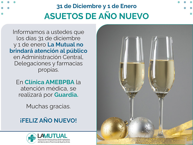 El 31 de diciembre y 1° de enero no habrá atención en Administración Central, Delegaciones ni farmacias propias. En Clínica AMEBPBA la atención se brindará únicamente por Guardia. ¡Feliz cierre de año y un comienzo lleno de salud y bienestar!