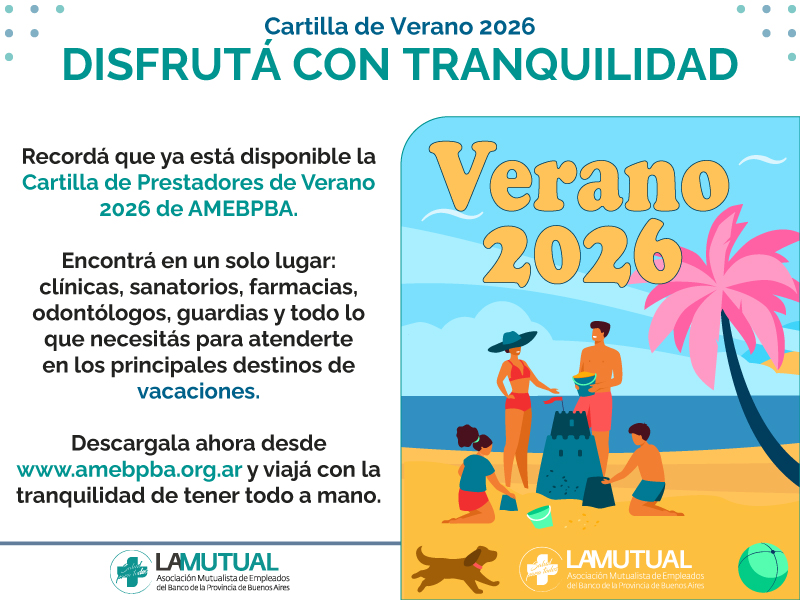 Ya está disponible la Cartilla de Verano AMEBPBA 2026. Clínicas, sanatorios, farmacias, odontólogos, guardias y más en los principales destinos de vacaciones. Encontrala acá y viajá con la tranquilidad de tener todo a mano.