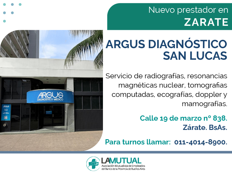 Te informamos que La Mutual ha incorporado de forma directa en Zárate a Argus Diagnóstico San Lucas, para cubrir la atención de todos los afiliados. Encontrá toda la información aquí.