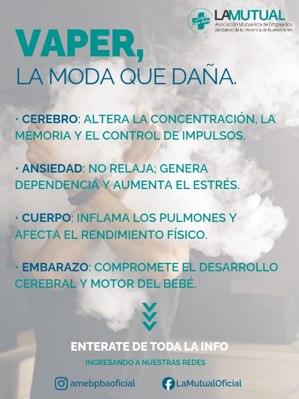 Los vapers no son tan inofensivos como parecen. Aunque se vendan como alternativa ‘más segura’, liberan sustancias tóxicas, metales pesados y pueden causar problemas respiratorios y metabólicos. Informate, cuidá tu salud y compartí este post para que más personas estén prevenidas. La Mutual te cuida.